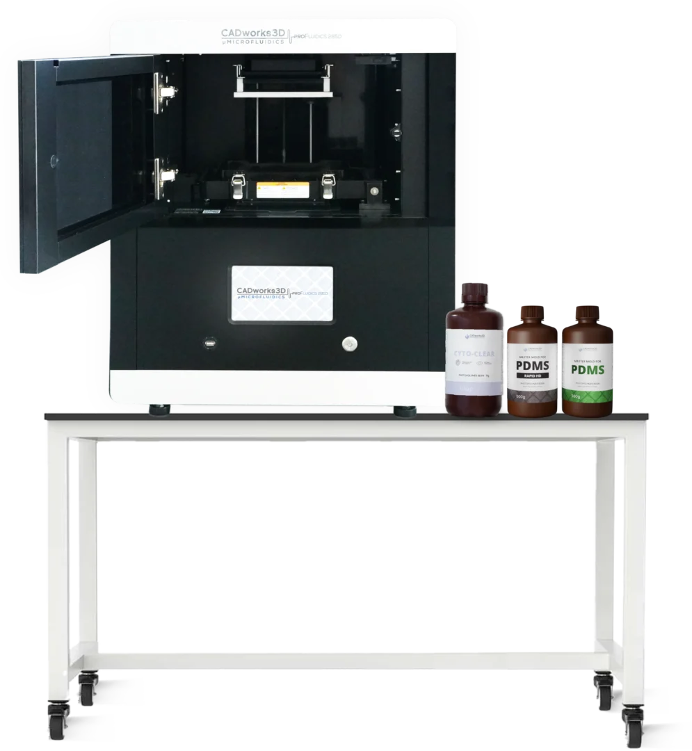 With our complete 3D printing system in your lab, you can design and fabricate customized microfluidic devices within a single day. The system includes 3 essential components: a high-performance 3D printer, specialized 3D materials, and a proven methodology. Together, these elements streamline your workflow and enhance both efficiency and precision in your lab.