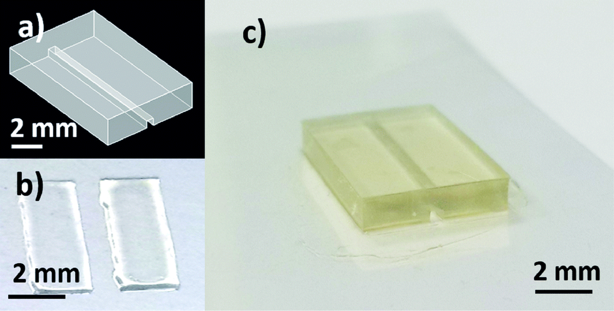 A flow chart outlining the fabrication process is shown in figure 3(a). Due to the limitation of the resin used in this work, printing closed channels was not deemed feasible. Instead, channels were printed open and a second print was used as a cover. The open channel and cover were each printed on glass and alignment features were designed on the open channel. A #3 round brush was used to lightly coat the contact surface of the open channel with uncured resin and then the cover was aligned and held firmly in place with a clamp during a post-cure process which fused the two prints together, resulting in a well-defined closed channel seen in figure 3(b). While using two prints to create closed channels was possible and repeatable, using a resin capable of closed channels would still be preferred in order to create a higher precision, single-step device