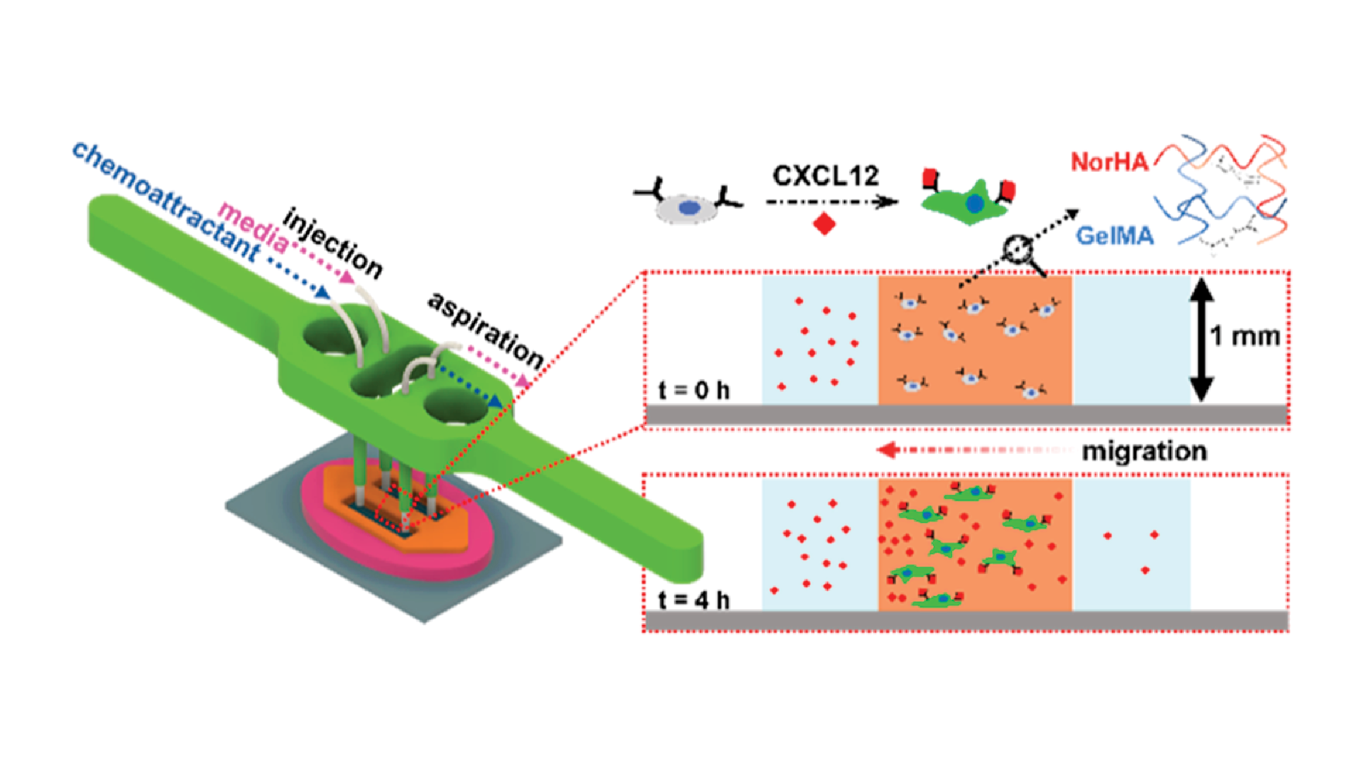 Glioblastoma (GBM) is the most common and aggressive type of primary brain cancer in adults (1) that remains incurable and recurs frequently, (2) highlighting the need for in vitro patient-specific models that can predict disease outcomes. Recent work has correlated the infiltrative nature of the disease to glioma cell migration characteristics, (3) but recapitulation of the chemical and biomechanical cues that affect cell migration in the tumor microenvironment (TME) remains a major challenge within these models. (4) Based on hyaluronan, which is a primary extracellular matrix component in the brain, hyaluronic acid hydrogel networks are known to induce dose-dependent alterations to markers of glioma malignancy. (5) The inclusion of hyaluronic acid-based hydrogel as a matrix, with soluble CXCL12 as a chemoattractant for CXCR4-expressing GBM cells (6) and with chemotherapeutic agents to eradicate them, (7) is being investigated as a less invasive and more targeted pathway to remove residual glioma cells from the TME. To complement prior work on coupling laminar flow profiles to rapid diffusion at flow streamlines in closed microfluidic systems, (8) we present an open-top microfluidic platform to create chemotactic gradients for spatiotemporal control of glioma cell migration in a patterned hydrogel of millimeter-scale depth that is designed to enhance cell–biomaterial interactions.